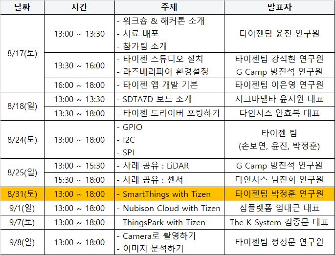 | [2019 서울 하드웨어 해커톤] 1일차 : 타이젠 환경설정(RPI3) 및 앱 개발 기초 (0) | 2019.08.17 |