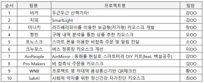 - 동료평가 : 당일 참가자들이 각 팀의 시작품 중 우수시작품에 투표하기
