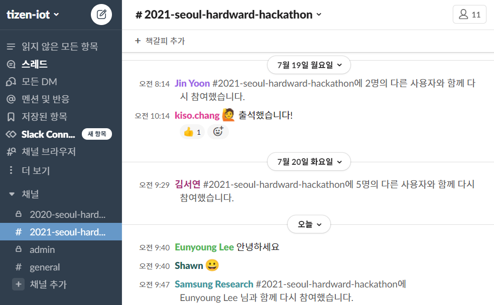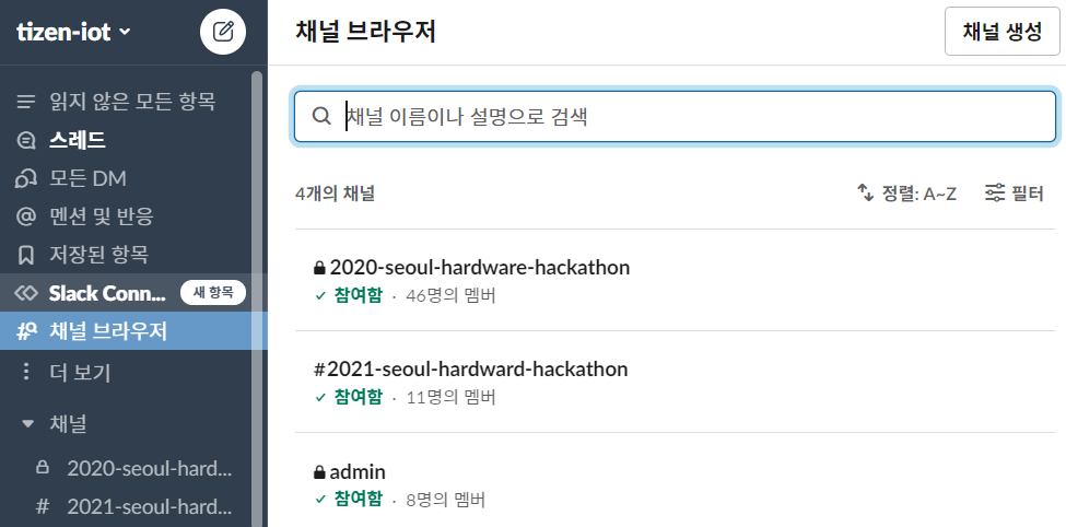 ② 채널 브라우저에서 #2021-seoul-hardware-hackathon 채널 들어가기