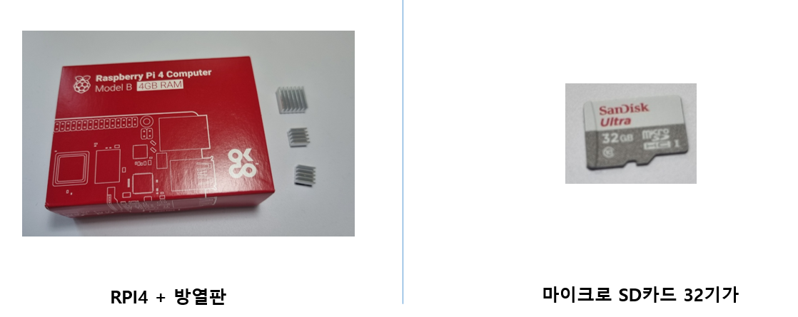- RPI4 + 방열판 + 마이크로 SD 카드(전원 유의)